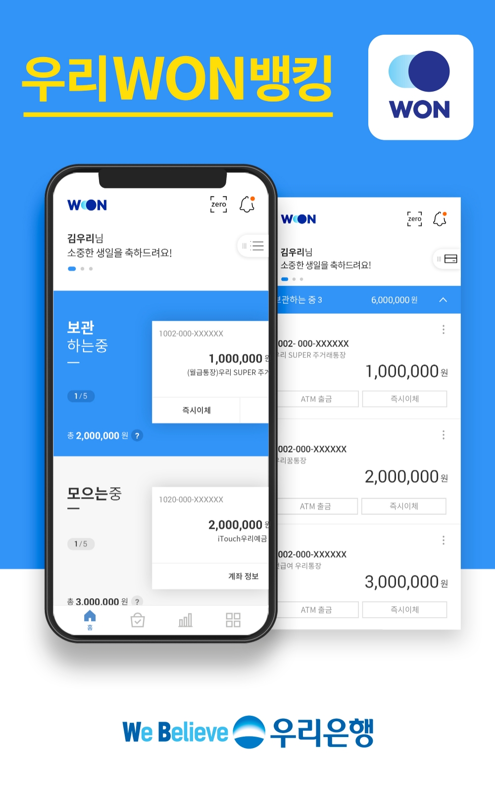 WON 통장은 개설만으로 스마트뱅킹 타행이체수수료, 우리은행 및 GS25편의점 자동화기기 현금인출수수료가 면제되는 입출식 통장으로 우리WON뱅킹과 우리은행 모바일웹 등에서 비대면 실명확인을 통해 개설할 수 있다.