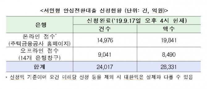 금융위원회는 이날 오후 4시 현재 서민형 안심전환대출은 약 2조8000억 원, 2만4000건이 신청됐다고 밝혔다. 첫날인 지난 16일에는 오후 4시 기준으로 약 8000억 원, 7200건이 신청됐으나 이후 온라인 신청과 오늘(17일)까지 받은 접수건까지 포함되면서 크게 늘었다.