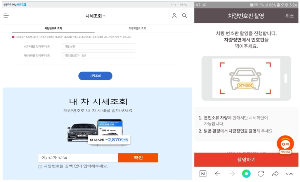 26일 저축은행, 신용카드사 등 금융업계에 따르면 신한카드가 운영하는 자동차 할부금융 플랫폼 '마이오토(MyAUTO)'에서는 '시세조회' 메뉴를 통해 차량모델로 조회하는 방식이나 차량번호로 조회하는 방식을 선택할 수 있다.
