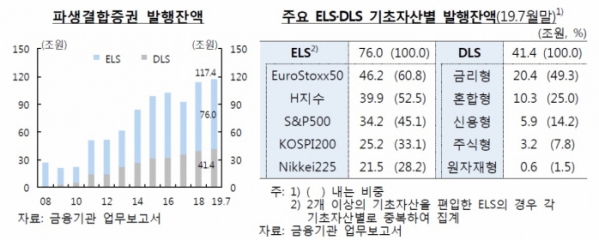 한은에 따르면, 7월말 현재 주가연계증권(ELS)과 DLS를 포함한 파생결합증권 발행잔액은 117조4000억 원에 이른다. 특히 지난한해 동안 21조6000억 원이 늘어 2014년(22조7000억 원 증가) 이후 4년만에 가장 큰 폭으로 늘었다. 종류별로는 ELS가 76조 원(64.7%), DLS가 41조4000억 원(35.3%)을 기록했다.