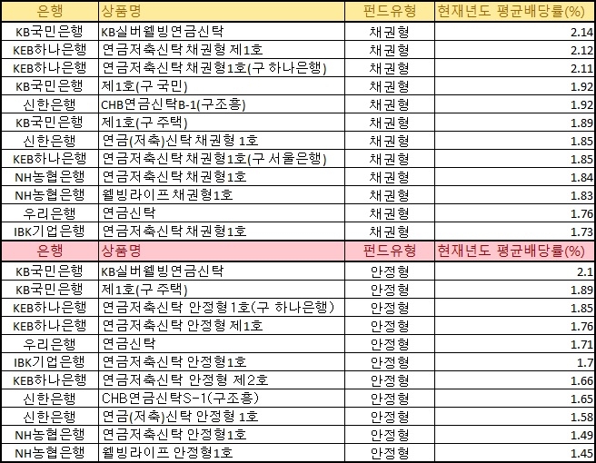3위와 4위는 하나은행의 연금저축신탁 안정형1호(구 하나은행)와 연금저축신탁 안정형 제1호가 각각 자리했다. 배당률은 각각 1.89%와 1.85%다.