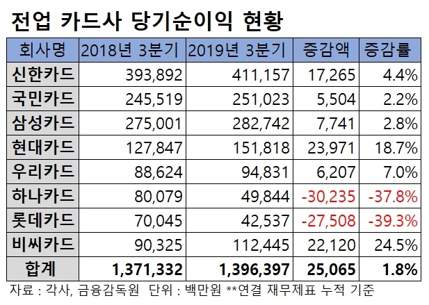 19일 신용카드업계와 금융감독원 등에 따르면 올들어 3분기까지 신한·KB국민·삼성·현대·우리·하나·롯데·비씨카드 등 카드사 8곳이 벌어들인 순이익은 총 1조3963억 원으로 지난해 같은 기간에 비해 1.8% 증가했다.