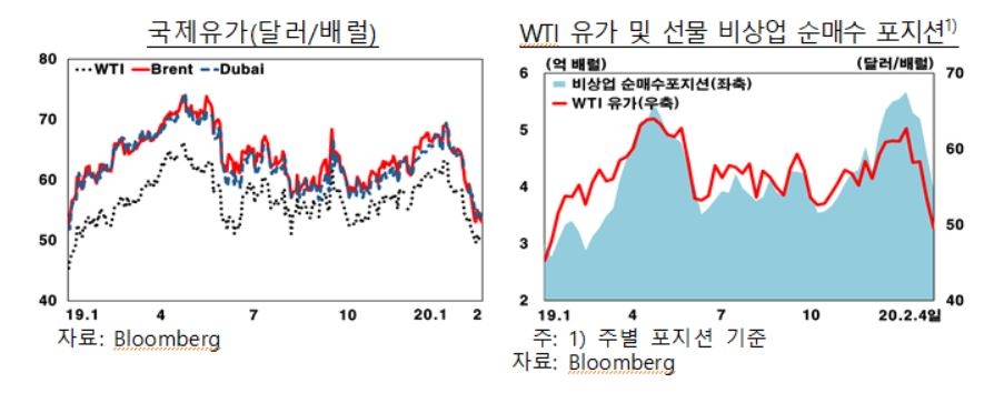 중국 우한에서 발생산 신종 코로나바이러스 감염증 확산에 따른 글로벌 수요둔화에 대한 우려가 커지면서 국제유가가 급락하고 있다. 국제유가는 앞으로 코로나바이러스 확산 정도, 주요 산유국(OPEC+) 추가 감산 여부, 리비아 내전과 같은 지정학 리스크 등의 정도에 따라 높은 변동성을 나타낼 것이라는 전망이 나왔다.