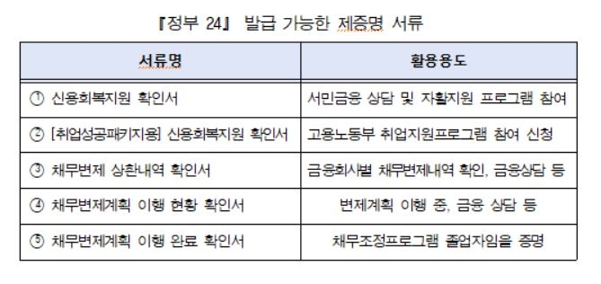 이미지 확대보기신복위에서 발급하는 제증명서류는 신용회복지원 확인서, 채무변제확인서 등이다. 금융취약 계층의 서민금융 상담과 신청 등에 주로 사용되고, 고용노동부 취업지원프로그램이나 지방자치단체 복지 신청 등에도 이용된다.