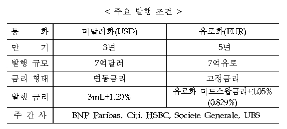 금리는 미달러화 만기 3년 변동금리 채권의 경우 3개월 리보금리에 1.20%를 더한 수준에서, 유로화 만기 5년 고정금리 채권의 경우 유로화 미드스왑금리(-0.221%)에 1.05%를 더한 0.829%로 결정됐다.