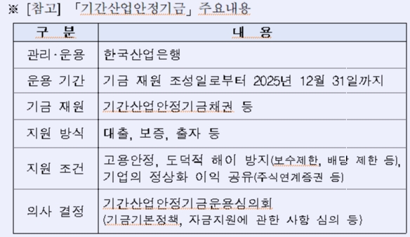 이 기금은 코로나19 등 갑작스런 경제상황의 변동으로 일시적 경영애로를 겪고 있는 기간산업 내 주요 기업에 대해 유동성을 지원함으로써 조기 경영 정상화에 일조할 전망이다.