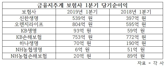 이미지 확대보기6일 KB금융지주, 신한금융지주, 하나금융지주, 농협금융지주 등 4개 은행계 금융지주사가 발표한 경영실적에 따르면 KB생명의 올해 1분기 당기순이익은 59억 원을 시현, 91억 원을 기록한 전년에 비해 35.1% 감소했다.