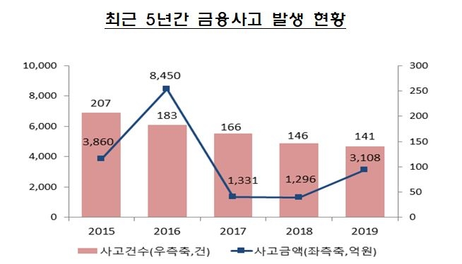 26일 금융감독원이 발표한 '2019년 금융사고 발생현황'에 따르면 지난해 금융 사고는 141건으로 전년의 146건보다 5건이 줄어든 것으로 집계됐다.