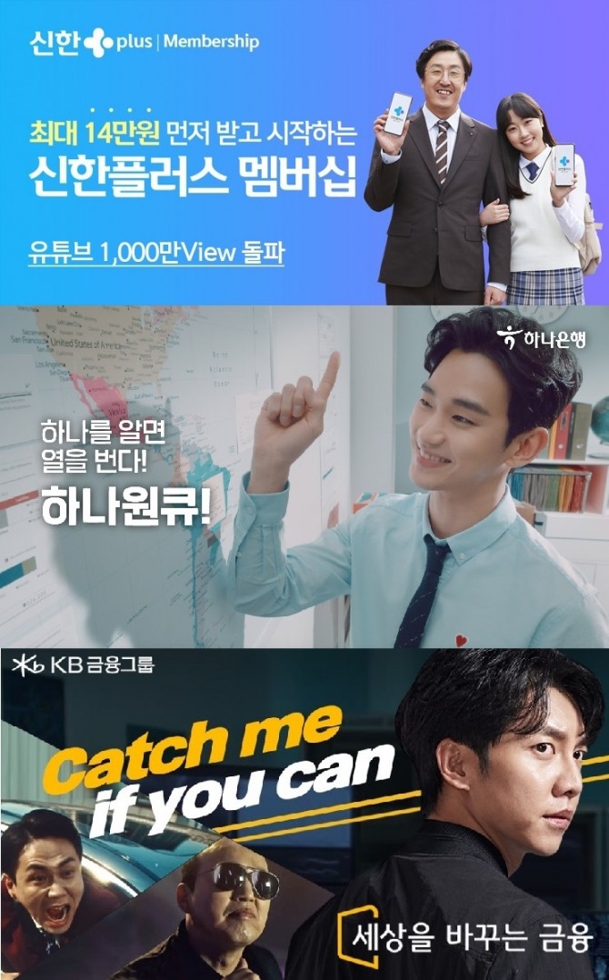 KB금융그룹의 유튜브 금융광고도 높은 인기다. 공개 2주만에 300만 조회수를 돌파한 KB금융의 광고영상은 KB의 비밀요원 이승기가 KB국민은행 등 KB금융그룹 계열사들의 다양한 서비스를 활용해 반대 세력을 따돌린다는 내용의 ‘첩보 영화’ 컨셉이다. 반대 세력으로 등장하는 대세 배우 오정세, 씬스틸러 김광규의 명품 연기와 숨은 조력자인 투머치토커 agent61의 등장까지 지루할 틈 없는 재미를 제공하며 인기를 끌고 있다.