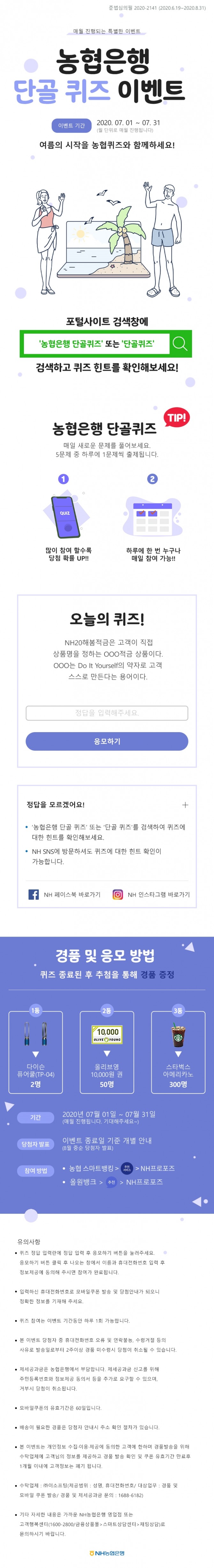 이미지 확대보기이벤트 응모는 NH스마트뱅킹과 올원뱅크의 추천 콘텐츠인 NH프로포즈에서 할 수 있다. 퀴즈 정답자를 대상으로 추첨을 통해 총 352명에게 다이슨 공기청정선풍기(2명), 올리브영 상품권 1만 원권(50명), 스타벅스 모바일 쿠폰(300명)을 경품으로 제공한다.