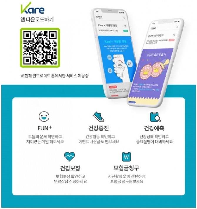 이미지 확대보기‘Kare’는 ‘건강증진·건강예측’ 서비스의 헬스케어 부문과 ‘건강보장·보험금청구’의 인슈어테크 부문, 게임 등 엔터테인먼트를 제공하는 ‘Fun+’로 구성됐다.