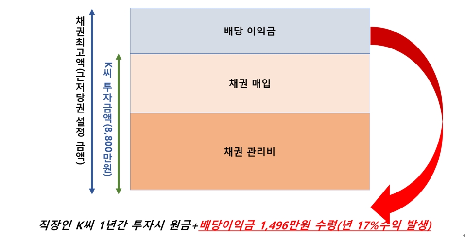 직장인 K씨는 채권매입금액 3억8천만 원에서 원금의 90퍼센트를 질권대출로 받고 실제 투자금액 8천8천만 원을 투자한다고 가정하다.
