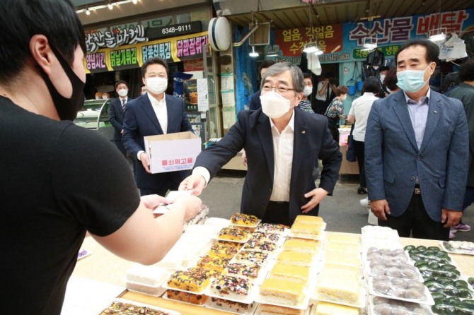 윤석헌 금융감독원장이 추석을 앞두고 24일 오전 서울 마포구 망원월드컵시장을 찾아 사회복지단체에 전달할 떡을 구입하고 있다. 사진=금융감독원