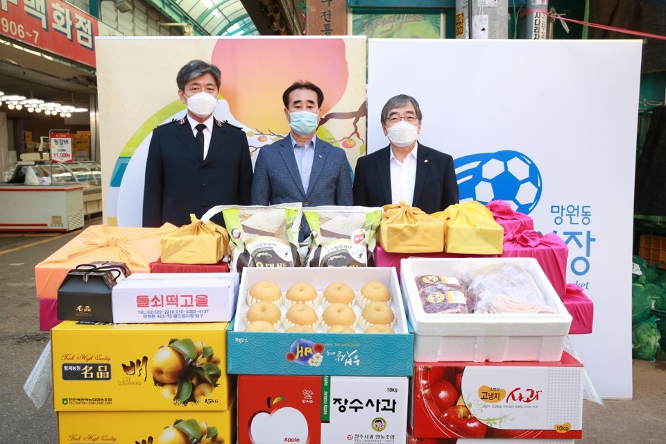 윤석헌 금융감독원장이 추석을 앞두고 금융회사 대표들과 24일 오전 서울 마포구 월드컵시장을 찾아 사회복지단체에 전달할 물품을 구입한 뒤 전달식을 갖고 있다. (왼쪽부터) 장만희 한국구세군 사령관, 반석병 월드컵시장 상인연합회장, 윤 원장. 사진=금융감독원
