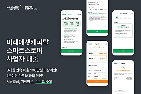 미래에셋캐피탈은 지난 6월 금융위원회로부터 지정대리인으로 선정된 네이버파이낸셜과 함께 온라인 소상공인에게 유리한 금리와 한도를 제공할 수 있는 대출 서비스를 위해 온라인 소상공인 ACSS를 구축했다.
