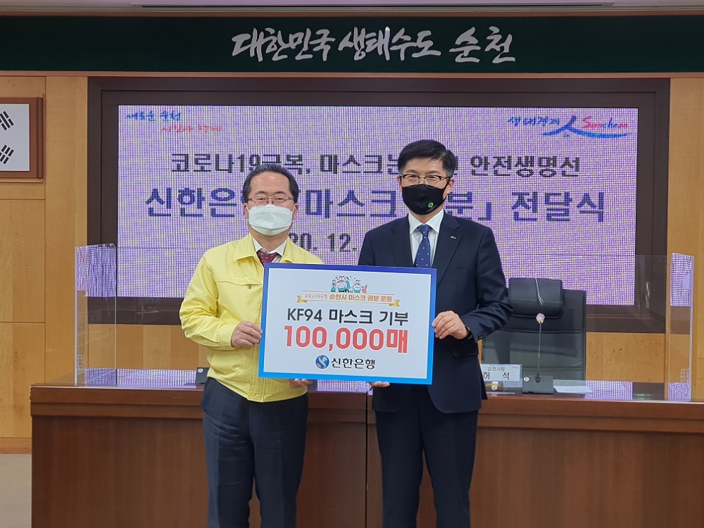 신한은행은 코로나19 감염증 사태와 관련해 순천시의 28만 시민에게 마스크를 전달하는 ‘마스크 100만개 모으기’운동의 취지에 적극 공감하며 사회적 기업으로서 역할을 충실히 하기 위해 기부를 결정했다.