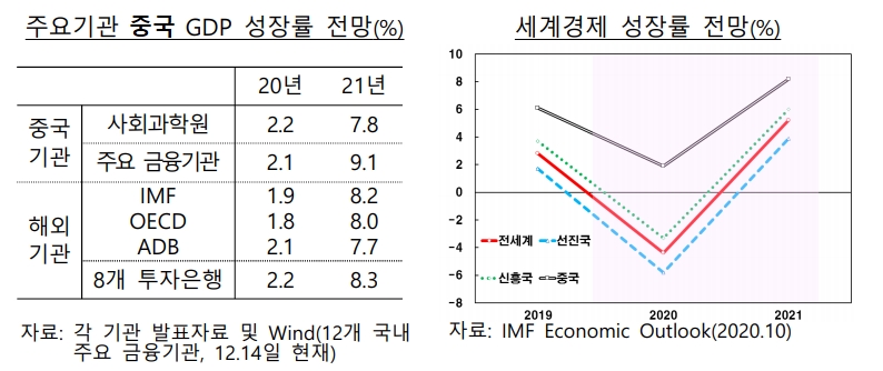 금융시장의 경우 중국경제의 빠른 회복세에 힘입어 시장금리와 주가는 상승했으며 위안화 환율은 5월 이후 강세를 지속하고 있다. 내년도 중국경제는 빠른 회복세를 이어가며 글로벌 경기회복, 소비회복의 본격화, 제조업 투자 확대, 전년도 기저효과 등으로 올해보다 높은 8%대의 성장세를 보일 전망이다.