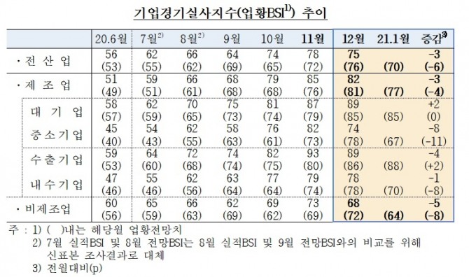 이미지 확대보기30일 한국은행이 발표한 ‘2020년 12월 기업경기실사지수(BSI)’에 따르면 12월 업황BSI는 제조업이 전월 대비 3포인트 하락한 82, 비제조업은 5포인트 하락한 68을 기록했다.