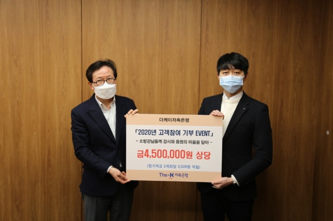 이미지 확대보기더케이저축은행은 올해 초 고객들이 가입하는 적금 계좌 수를 연말까지 집계하고, 1계좌 당 2020원으로 계산해 산출된 금액을 한국소방복지재단에 기부하는 '2020년 고객참여 기부 이벤트'를 해 약 450만 원 상당의 금액을 기부금으로 기탁했다.
