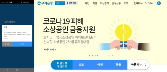 우리WON뱅킹 애플리케이션(앱)을 누르면 '앱 시작에 필요한 정보를 받아오지 못했다'는 안내 문구가 뜨며 앱이 열리지 않았다.