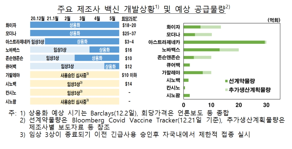 보고서에 따르면 최근 주요국에서 코로나19 백신 접종을 시작하면서 백신 상용화 시기가 예상보다 빠르게 도래하고 있다. 백신 공급계획 등을 감안할 때 선진국을 중심으로 2021년 하반기 중 집단면역에 가까워질 것으로 보이나 백신접종 거부감, 일부 백신의 출시 지연 가능성 등은 코로나19 조기 종식의 제약요인으로 작용할 소지가 있다.