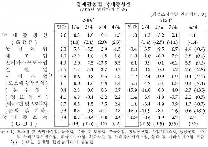 분기별 성장률은 신종코로나바이러스감염증(코로나19)가 심한 1분기와 2분기에는 각각 마이너스 성장세를 보였지만, 코로나 상황이 호전된 3분기엔 2.1%, 4분기엔 1.1% 로 반등했다. 4분기에는 반도체와 화학제품을 중심으로 수출이 5.2% 늘었지만 서비스업과 재화 등 민간소비가 1.7% 준데도 정부 소비마저 건강보험급여비 지출을 중심으로 0.4% 줄면서 소폭 성장에 그쳤다.