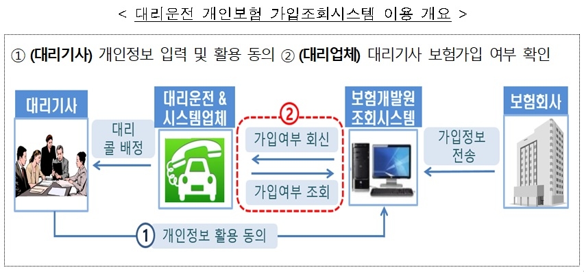 개인보험을 가입한 대리기사가 해당 시스템에 접속해 본인의 개인정보 입력과 정보활용 동의를 하면, 대리업체는 대리콜을 받은 경우 시스템을 통해 대리기사의 보험가입 여부를 확인한 이후 해당 대리기사에게 대리콜을 배정하게 된다.