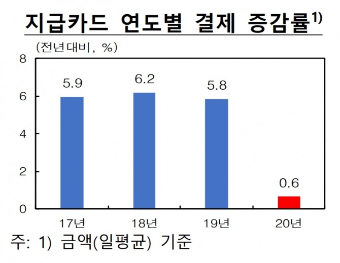 한국은행은 “지급카드 종류별로 보면 신용카드가 0.3% 감소로 전환되고 체크카드 증가세도 1.5%로 둔화됐다”며 “과거 신용카드 사용액이 전년대비 감소한 것은 1998년 -9.1%, 2003년 -22.2%, 2004년 -26.8% 세 차례뿐”이라고 설명했다. 그러나 선불카드는 긴급재난지원금 사용 등으로 590.8% 급증했다.