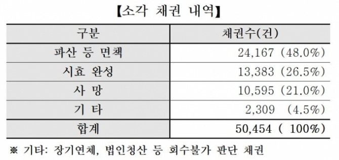 이번에 소각한 채권은 해당 대부금융업체가 장기간 연체돼 회수가 어렵다고 자체 판단한 채권들이며 파산 등 면책채권 2만 4167건, 시효완성채권 1만 3383건, 사망채권 1만 595건, 장기연체·법인청산 등 기타 2309건 등이다.