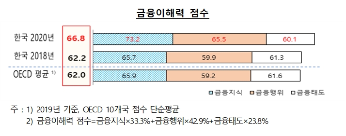 이미지 확대보기29일 한국은행이 발표한 2020 전국민 금융이해력 조사 결과에 따르면 우리나라 성인의 금융이해력 총점은 66.8점으로 2018년 62.2점 대비 4.6점 상승했으며 OECD 평균 62.0점(2019년 )을 넘어섰다.