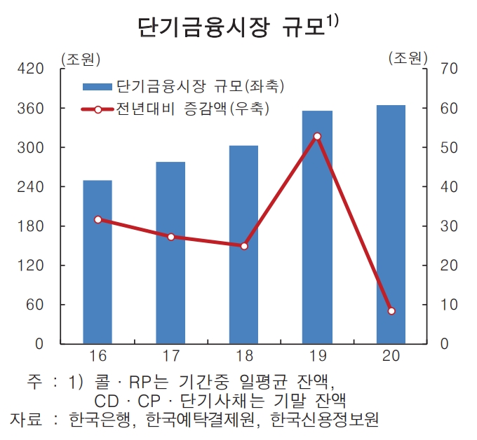 반면 RP시장은 단기자금시장의 풍부한 유동성, 자산운용사의 RP매도를 통한 자금조달 확대 등으로 성장세를 이어갔고, 콜시장은 대체로 감소를 지속하다가 증가로 전환됐다.