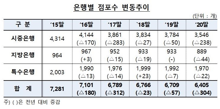 이미지 확대보기14일 금융감독원이 발표한 '2020년 국내은행 점포 운영현황'에 따르면 지난해 말 국내은행 점포 수는 6406개로 전년(6709개) 대비 304개 감소했다.