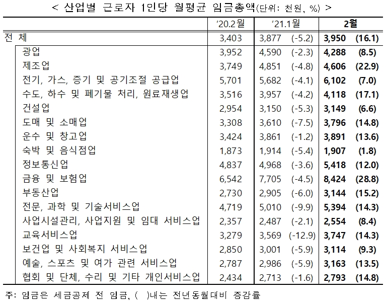 금융보험업 종사자의 월평균 임금은 산업별로 구분 했을 때 가장 많았다. 가장 급여가 낮은 산업은 숙박 음식업 종사자로 나타났다. 숙박 음식업 종사자는 월평균 189만5000을 벌었으며 근로시간은 142.2시간으로 조사됐다.