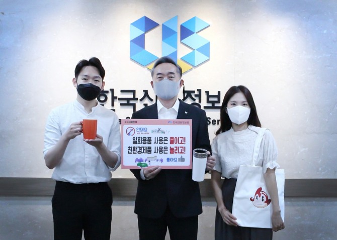신현준 한국신용정보원 원장은 이날 '일회용품 사용은 줄이고!, 친환경 제품 사용은 늘리고!'라는 실천 약속 메시지를 제안하며 챌린지에 참여했다.