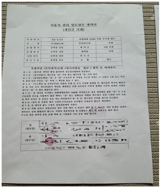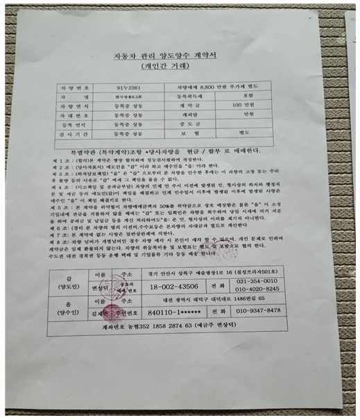 이미지 확대보기대전에 거주하는 K씨는 화물자동차 지입기사로 일하기 위해 동창의 소개로 경기도 안산시에 있는 알선업자 B씨를 소개받았다. B씨는 6.5t 화물 중고차량을 K씨에게 8900만 원에 판매한다는 '매매계약서(자동차 관리 양도양수 계약서-개인간 거래)'를 작성해 교부했다. B씨가 교부한 계약서에는 판매자 성명은 B씨, 판매자 주소는 경기도 안산시 상록구 ○○○라고 기록돼 있다.