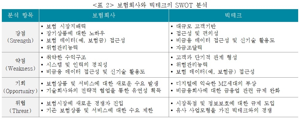 보험회사와 빅테크의 SWOT 분석. 자료=보험연구원