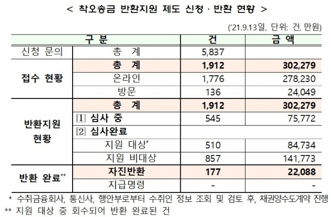 그 외 545건은 지원대상 여부에 대한 심사 중에 있으며, 857건은 보이스피싱 의심·절차 미비 등의 이유로 지원대상에서 제외됐다.