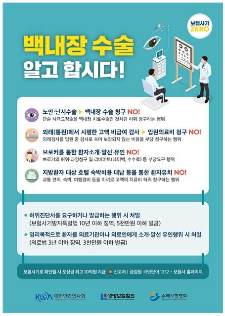 이번 캠페인의 주요 내용은 ‘백내장 수술 알고 합시다!’란 유의사항 안내로 대한안과의사회의 계도 공문과 생‧손보협회가 제작한 데스크용 유의안내 포스터를 배포한다. 의료소비자와 병의원 관계자가 불법행위를 할 경우 보험사기방지특별법 상 10년 이하 징역, 5000만 원 이하의 벌금‧의료법상 3년 이하 징역, 3000만 원 이하의 벌금에 처할 수 있음을 안내한다. 아울러 보험사기 신고처와 포상금 제도(적발시 최대 10억 원)를 안내해 보험사기 제보 활성화도 적극 유도하고 있다.