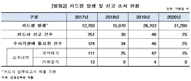지난해 3만 개 이상 가맹점에서 ‘카드깡’ 범죄가 발생했지만 카드사 신고는 단 25건에 그친 것으로 드러났다.