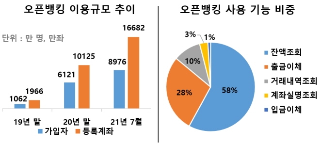 16일 금융위원회에 따르면 지난 7월 기준 오픈 뱅킹 서비스의 누적 가입자 수는 8976만 명, 등록 계좌 수는 1억6682만 좌이다. 출시 직후인 2019년 12월 말 누적 가입자 수가 1062만 명, 계좌 수가 1996만 좌에 불과했던 것을 고려하면 2년새 8~9배 가량 성장한 것이다.