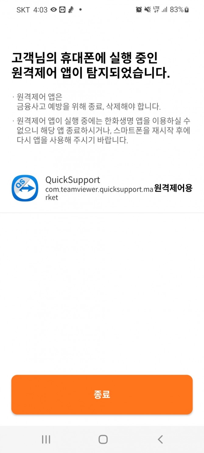 한화생명 앱 실행 순간 고객의 휴대폰에 '악성앱 '· '원격제어 앱' 구동여부 확인