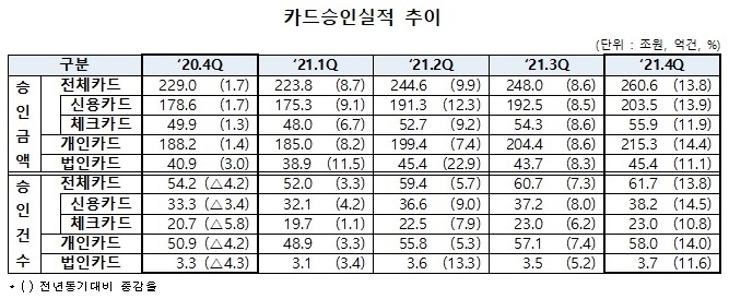 이미지 확대보기28일 여신금융협회에 따르면 지난해 4분기 전체카드 승인금액과 승인건수는 전년 동기 대비 각각 13.8%씩 증가한 260조6000억원, 61억7000건을 기록했다.