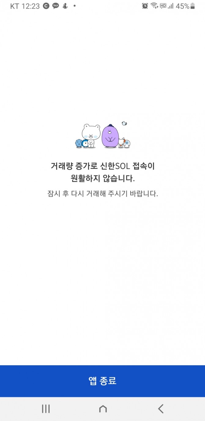 신한은행 쏠과 인터넷뱅킹은 오전부터 "거래량 증가로 신한 쏠 접속이 원할하지 않습니다", "처리중 오류가 발생하였습니다"라는 안내 문구가 게시되며 이용이 불가능한 상태다.
