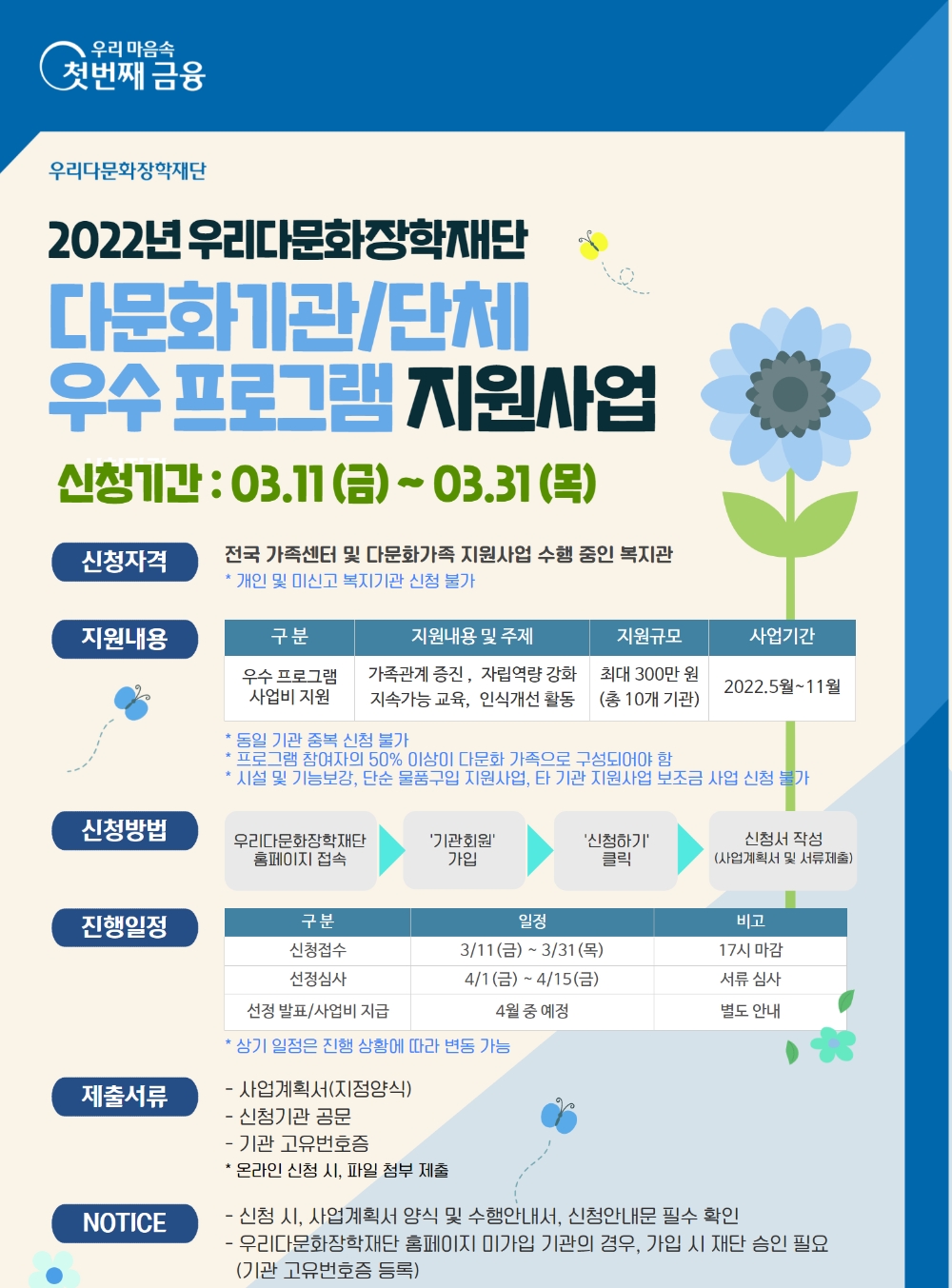 우리금융그룹 우리다문화장학재단은 다문화 가족 지원을 위한 ‘2022년 다문화기관·단체 우수 프로그램 지원사업’을 실시한다.