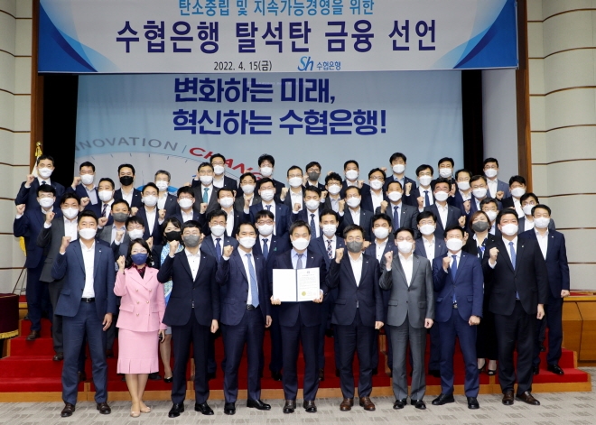 이미지 확대보기15일 수협은행은 서울 송파구 수협은행 본사에서 탈석탄 금융 선언식을 열어 ESG에 대한 비전과 추진로드맵 등 구체적 운영전략과 향후과제를 공유했다고 밝혔다.