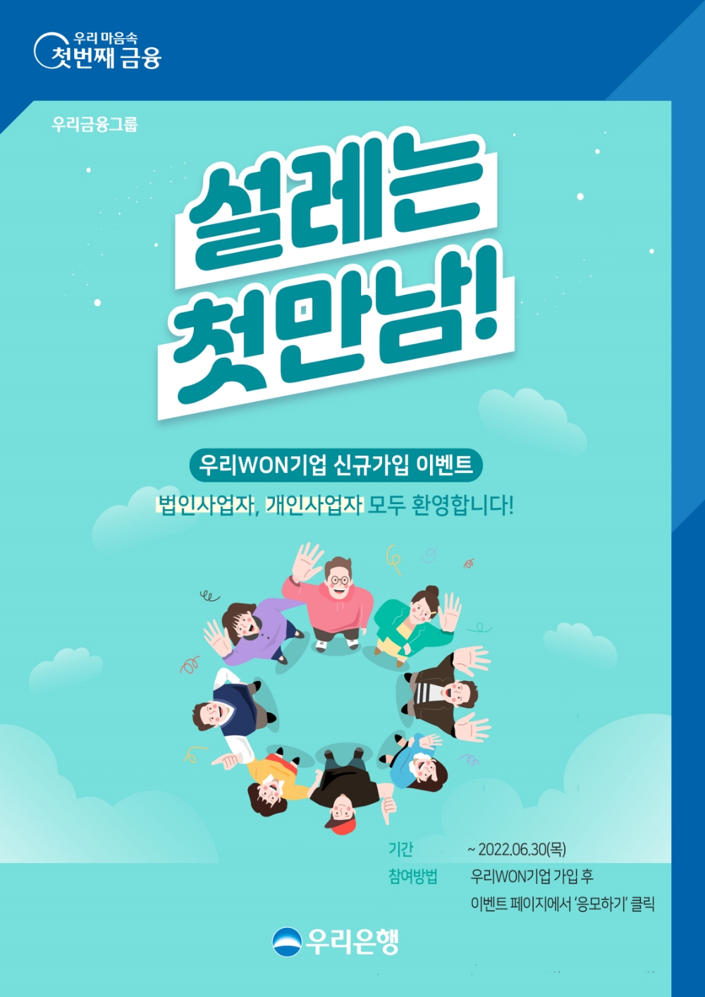우리은행(은행장 이원덕)은 '우리WON기업' 신규 가입고객 대상으로 '설레는 첫만남!' 신규가입 이벤트를 6월30일까지 실시한다.