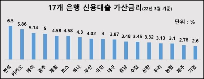 3월 신용대출 가산금리, 6.5% vs 2.6%···산정 기준 의구심 증대