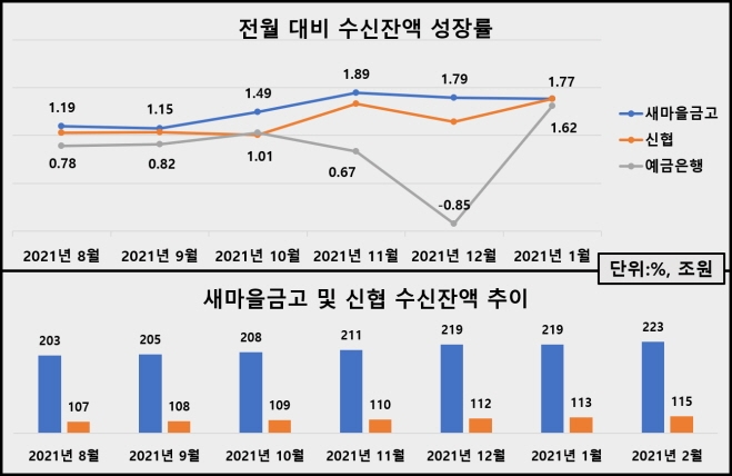 2월 기준 새마을금고·신협 수신, 전월比 3.9조, 2조 확대