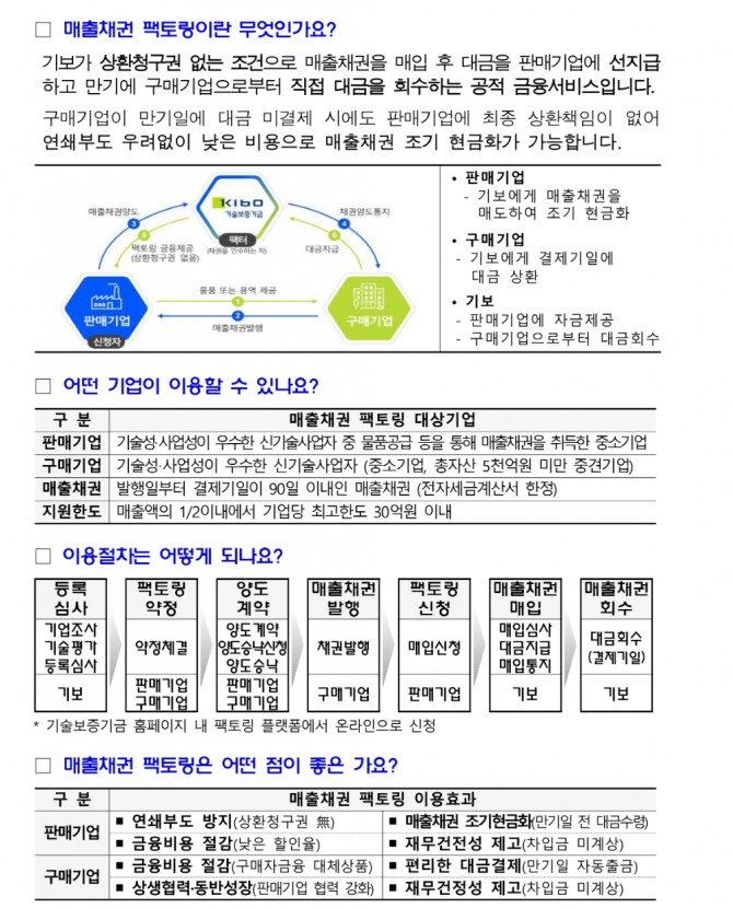 팩토링은 매출채권 양도로 자금을 융통하는 단기금융서비스로, 기보가 중소기업에 직접 자금을 지원하는 사업이다.