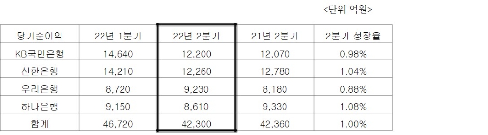 그럼에도 불구하고 1분기와 2분기 순이익을 합친 상반기 순이익의 합계는 8조9020억원으로 지난해 상반기에 기록한 역대 최대치 순이익(8조904억원)보다 8116억원 이상 늘었다. 여기에 2분기 4대 금융지주사의 영업이익 컨센서스는 총 5조9880억원으로, 6조원에 바짝 다가설 것으로 예측됐다. 1년 전 5조8251억원보다 약 3%(1630억원) 많다.